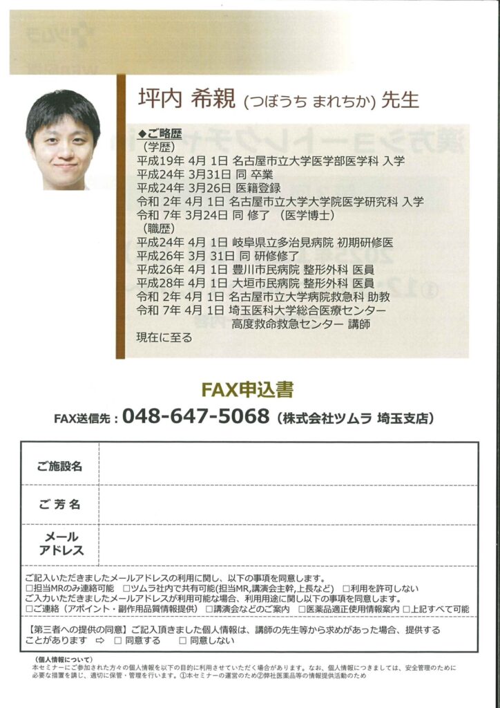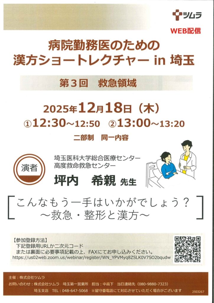 【登壇情報】病院勤務医のための漢方ショートレクチャーin埼玉 お知らせ 2025.12.15(月) 12月18日に開催される病院勤務医のための漢方ショートレクチャーin埼玉にて、当センター整形外科チームの坪内希親が登壇いたします。 12:30〜12:50 / 13:00〜13:20 二部制(同一内容) 登壇者:坪内希親(整形外科チーム) 演題:こんなもう一手はいかがでしょう?〜救急・整形と漢方〜 « 前へ 最新情報一覧へ